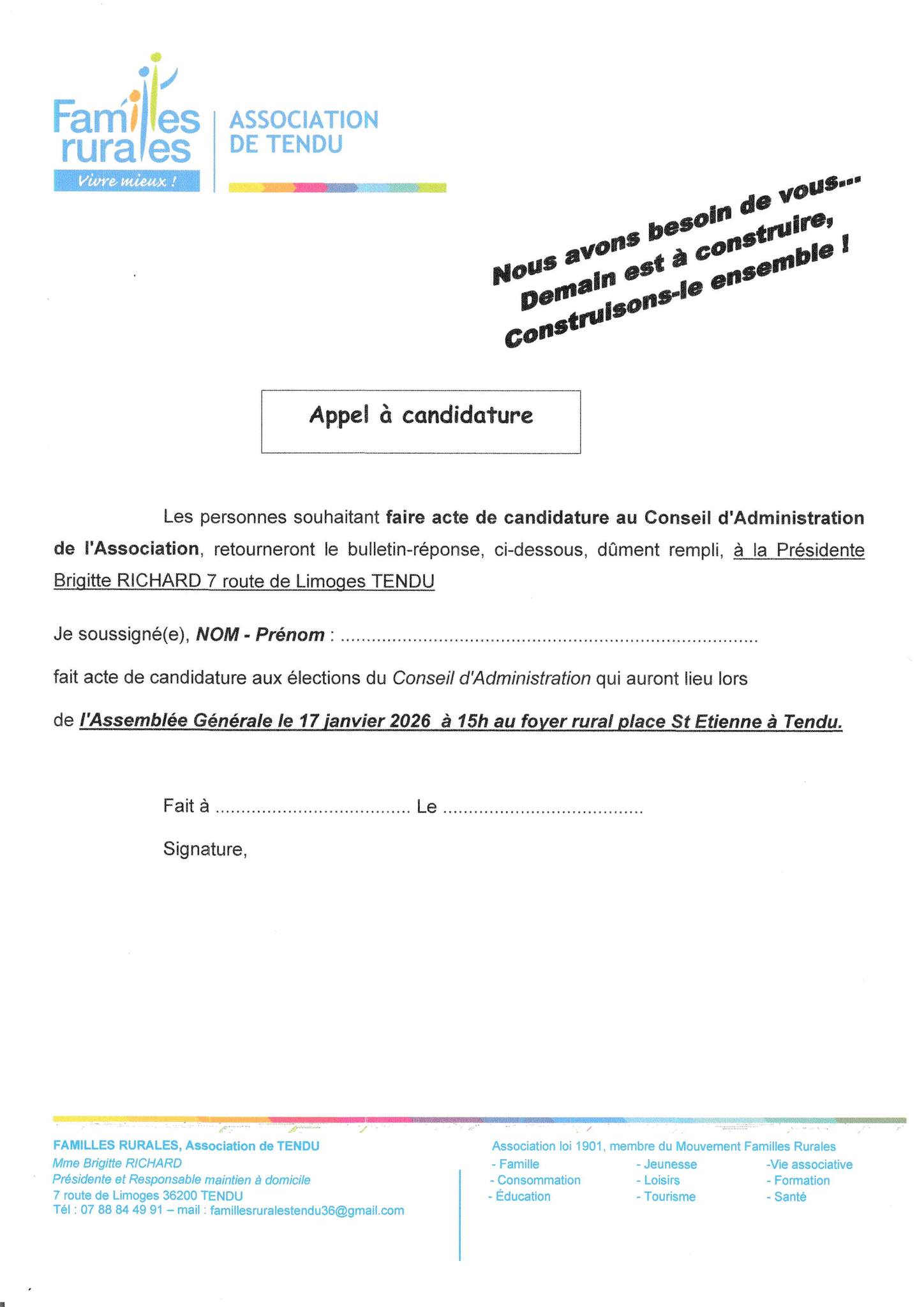Merci d’adresser votre CV et votre lettre de motivation par courrier à la mairie 1 Route de Celon